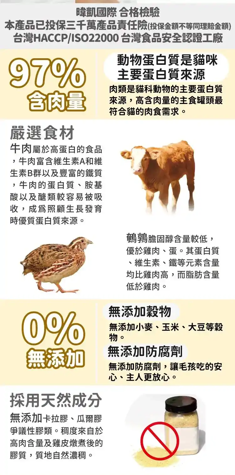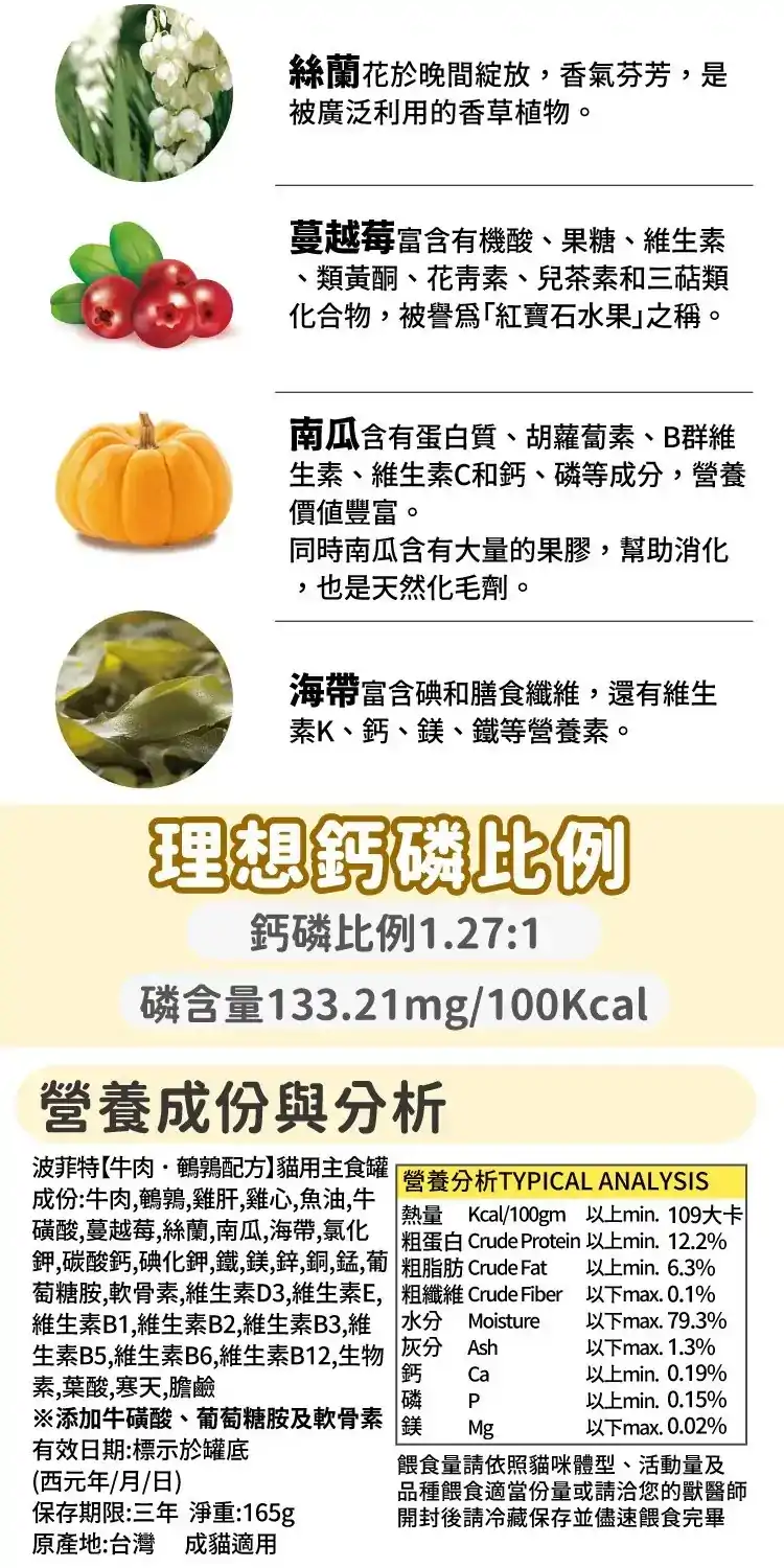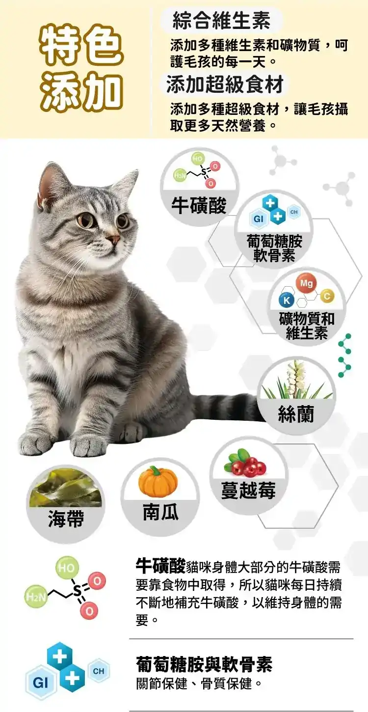 成分:牛肉,鵪鶉,雞肝,雞心,魚油,牛磺酸,蔓越莓,絲蘭,南瓜,海帶,氯化鉀,碳酸鈣,碘化鉀,鐵,鎂,鋅,銅,錳,葡萄糖胺,軟骨素,維生素D3,維生素E,維生素B1,維生素B2,維生素B3,維生素B5,維生素B6,維生素B12,生物素,葉酸,寒天,膽鹼
