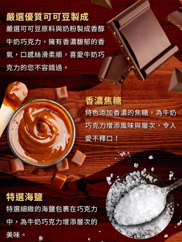 將香濃牛奶巧克力與焦糖的甜美、海鹽的鹹香完美結合,