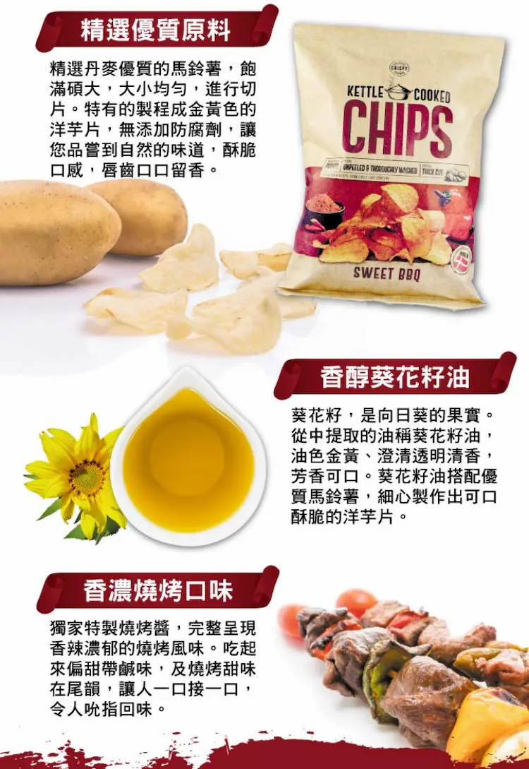 成份:馬鈴薯,葵花籽油,番茄粉,鹽,糖,果糖,味精,起司粉(芝士,磷酸氫二鈉、乳清粉),紅椒粉,乳清蛋白(牛奶),洋蔥,馬鈴薯纖維,麥芽糊精,香料,奶粉,大蒜,辛香料提取物(紅椒,辣椒),葡萄糖漿,煙燻香料,牛奶蛋白。本產品含有牛奶製品