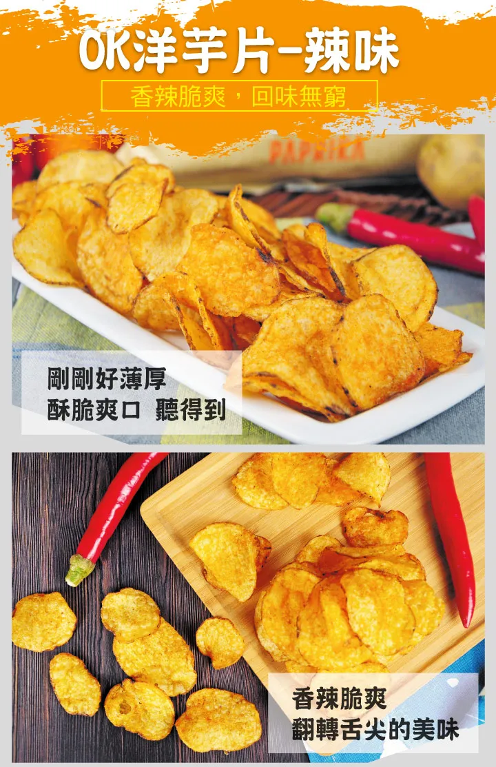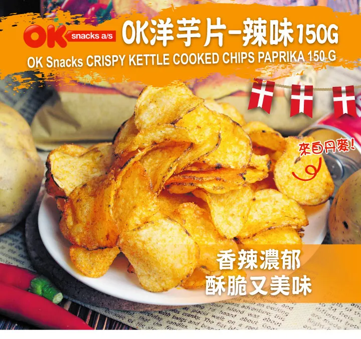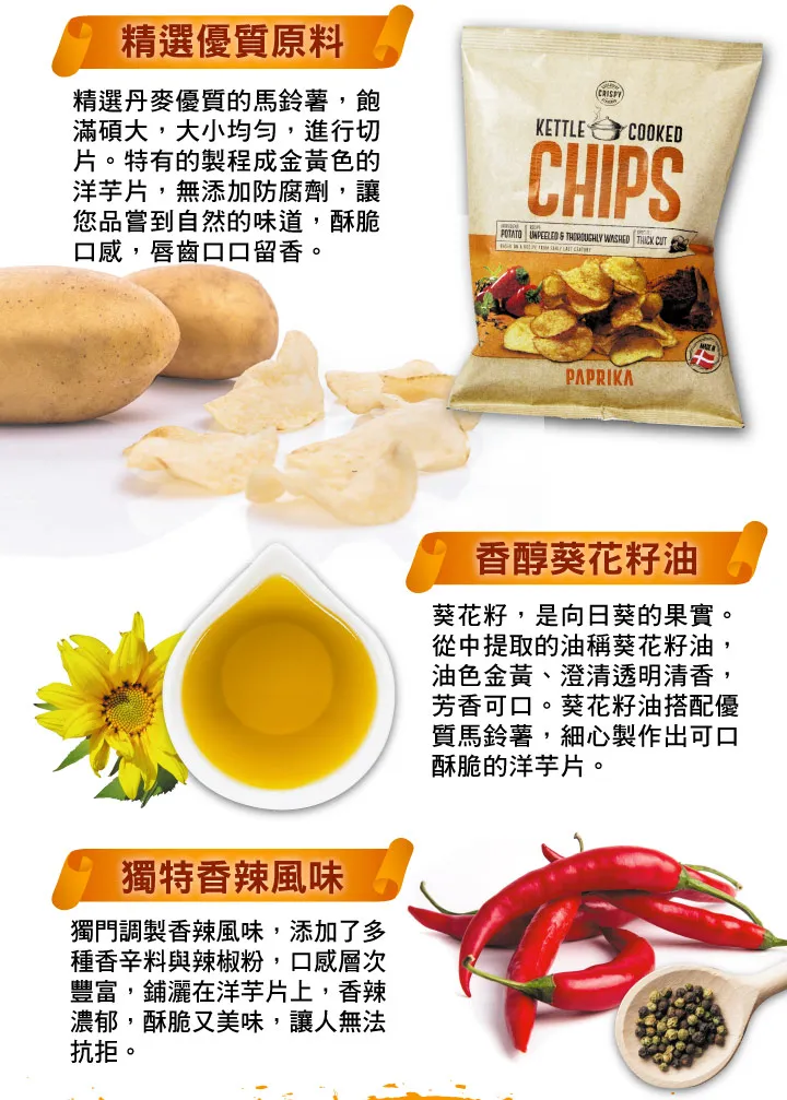 成份:馬鈴薯,葵花籽油,鹽,麥芽糊精,紅椒粉,糖,洋蔥,辣椒,酵母提取物,辛香料(辣椒),辛香料提取物(黑胡椒)