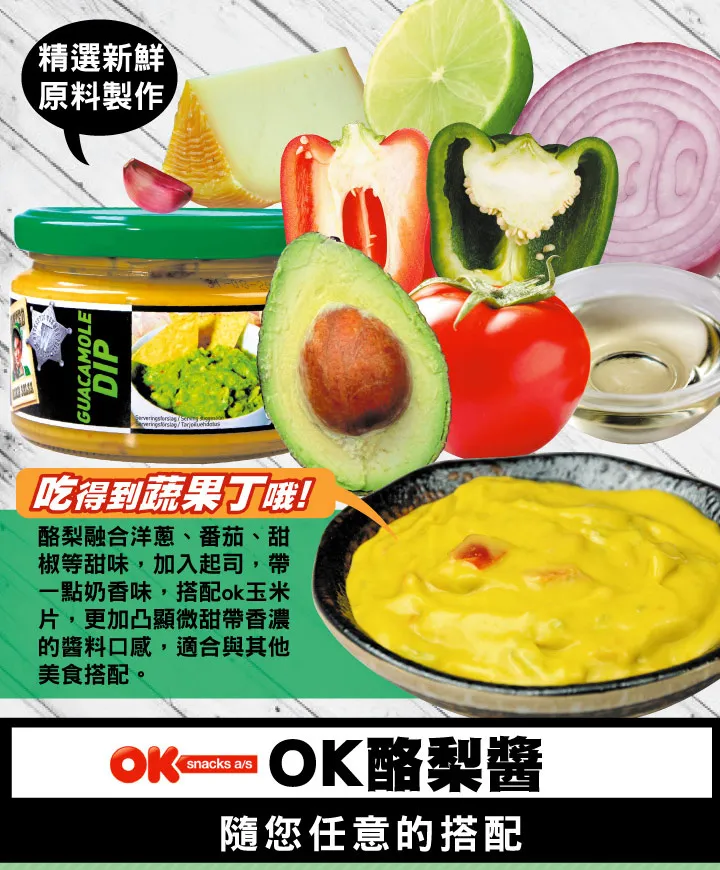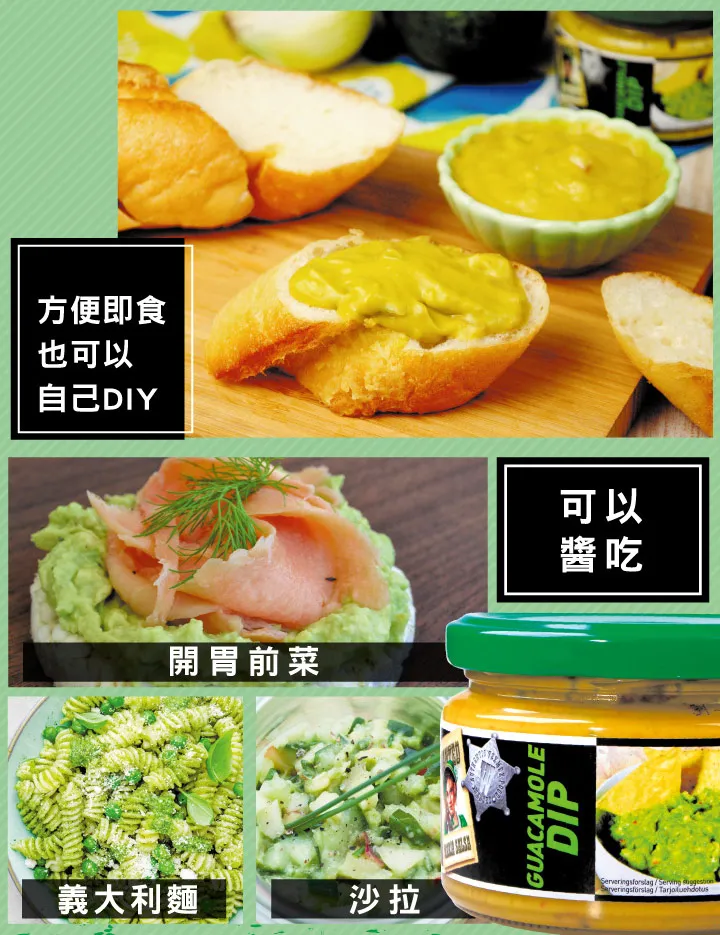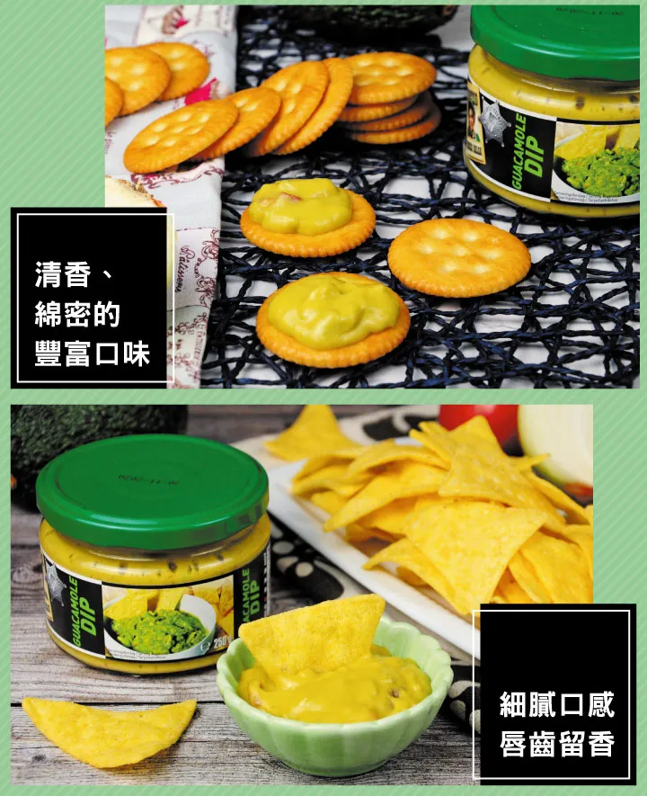 成份:水,洋蔥,番茄,綠甜椒,紅甜椒,油菜籽油,起司(牛奶,鹽,乳酸菌,凝乳酵素),酪梨,酸處理澱粉,乳蛋白,青辣椒,鹽,糖,墨西哥辣椒,椰子油,濃縮檸檬汁,檸檬酸,玉米糖膠,關華豆膠,多磷酸鈉,香料,香辛料(大蒜,辣椒),β-胡蘿蔔素,食用藍色一號,抗氧化劑(維生素C)。 本產品含有牛奶,堅果類製品