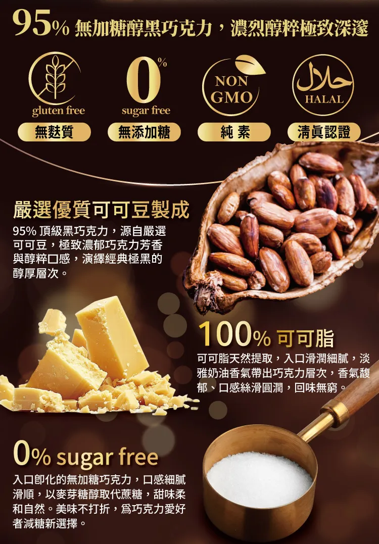 成分:可可塊,可可脂,甜味劑(麥芽糖醇),大豆卵磷脂,香莢蘭醛。
