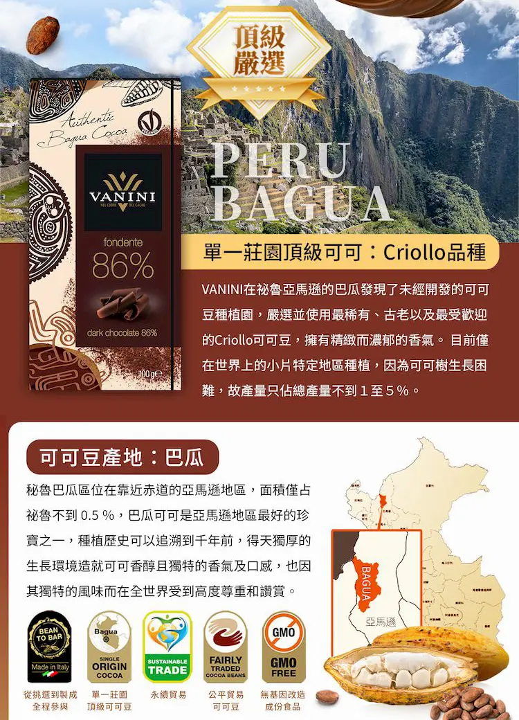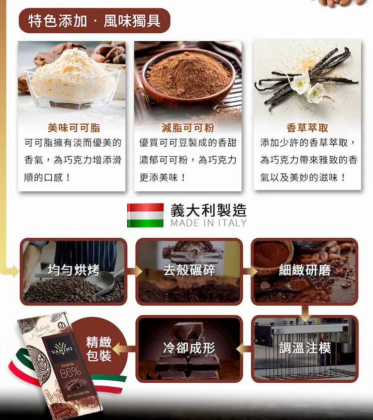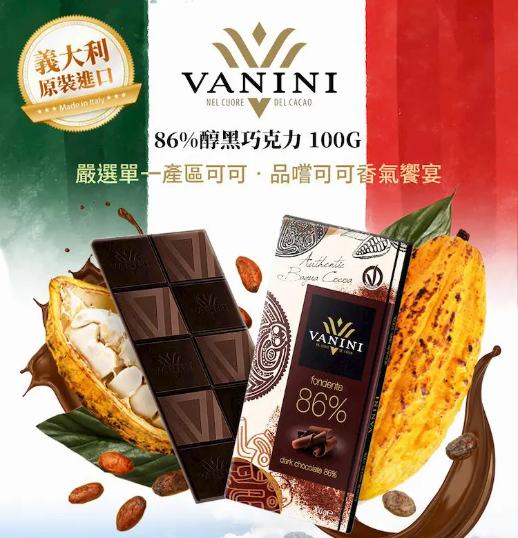 瓦尼尼86 %醇黑巧克力體驗這款義大利經典的巧克力,