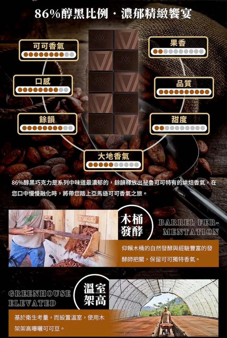 86%的可可成分帶來強烈而平衡的風味,每一口都充滿了深邃的可可香氣,讓你深入體驗巧克力的層次與細膩。
